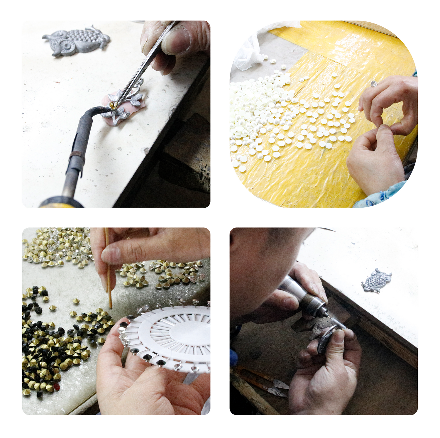 Here we have divided it into four parts: In the first picture, we can see that our handicraft aunt is setting diamonds by hand.
